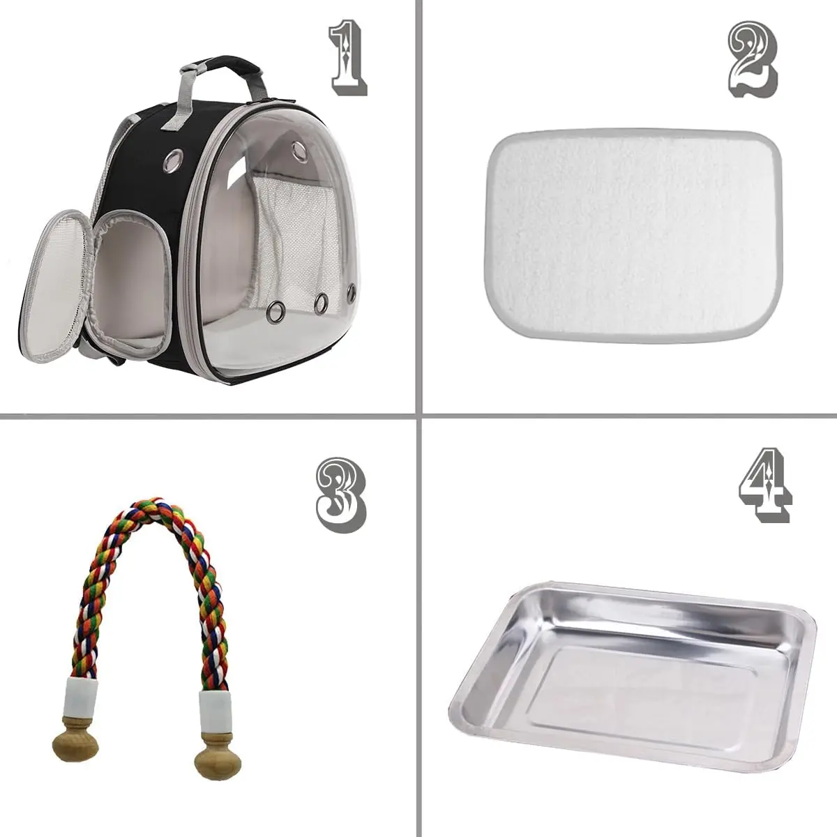 Package Includes: 1 x bird backpack carrier; 1 x bendable rope stand perch; 1 x stainless steel plate, 1 x washable soft mat for replacement;